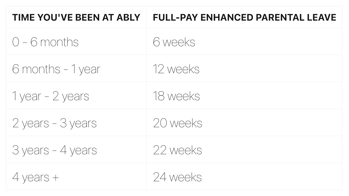 To benchmark our existing policy, we researched leading parental leave policies in companies we compare ourselves to and aspire to be. Throughout this process, the Ably values guided us, particularly the principles to be inclusive, compassionate, and competitive.