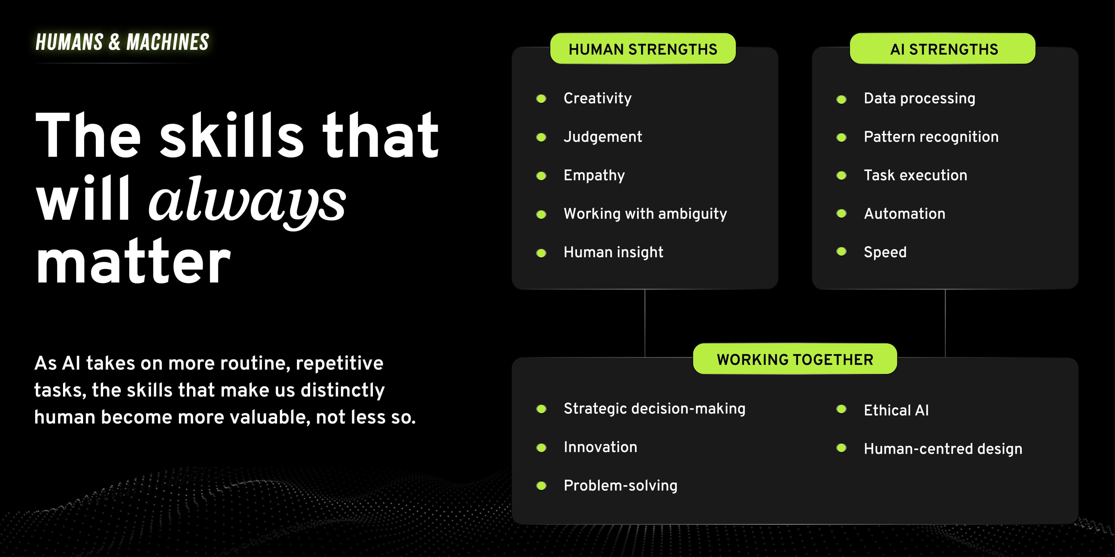 The real shift isn't about humans versus machines – it's about how people grow when technology is designed to support them, not sideline them. As AI becomes part of everyday work, the skills that matter most are changing.
