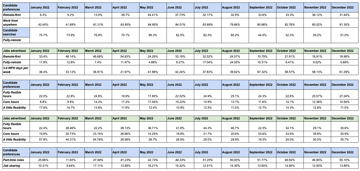 Job-sharing roles also became more popular in 2022. The number of job seekers expressing a preference for job sharing increased by 40% - up from 10% to 14%.