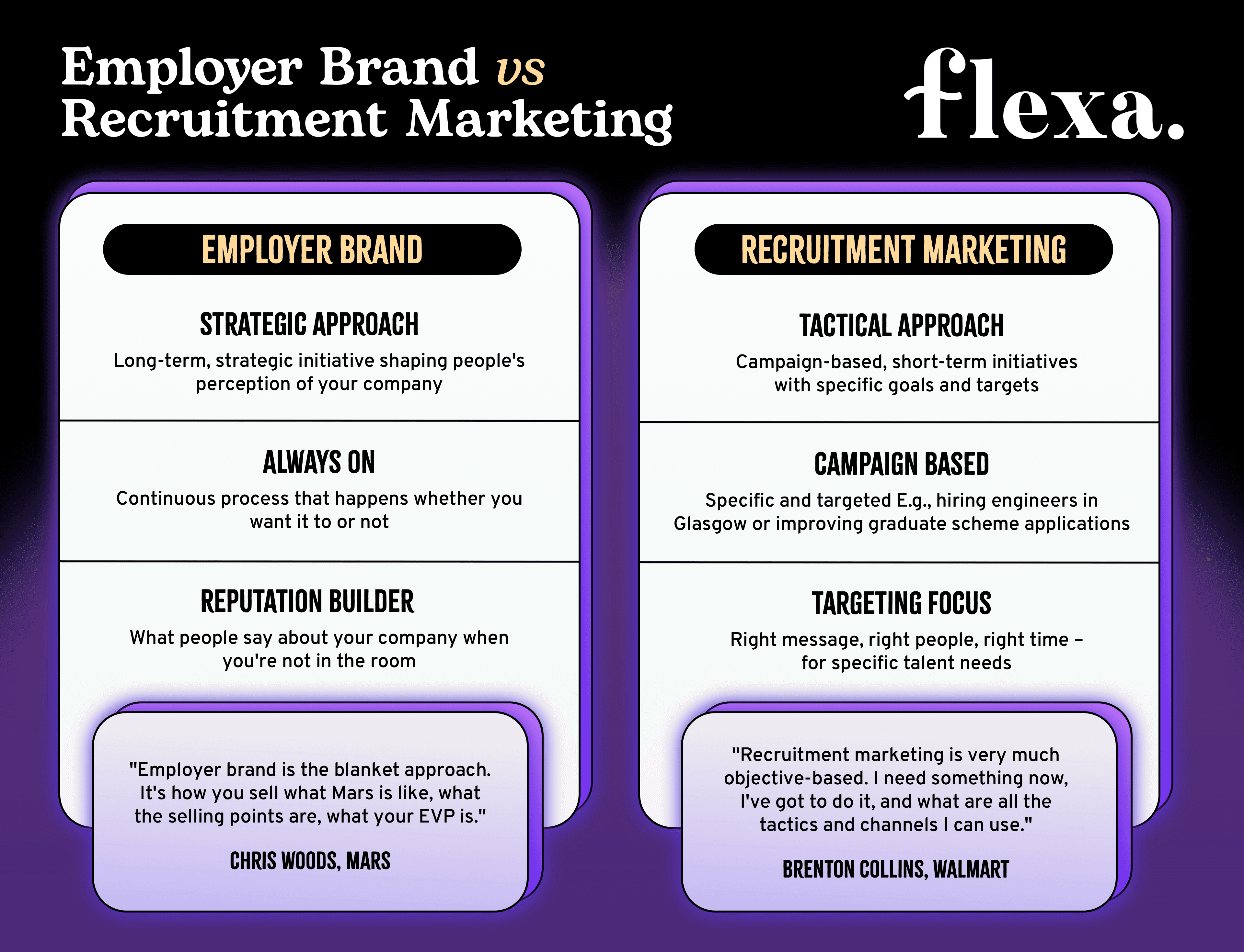 Brenton from Walmart described recruitment marketing as: "Very much objective-based. I need something now, I've got to do it, and what are all the tactics, channels, and strategy I can use to deliver what's needed to reach that objective."
