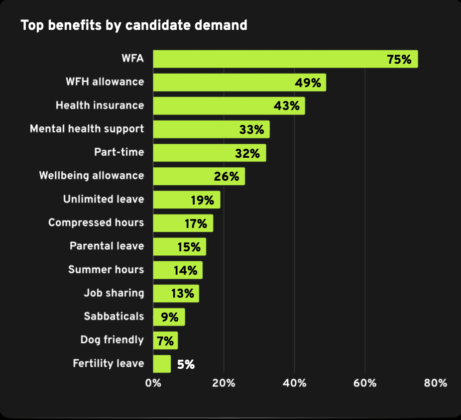 Work from anywhere (WFA) schemes have continued to hold the top spot when it comes to benefits over the past year, with three-quarters of candidates prioritising this as part of their desired benefits package.